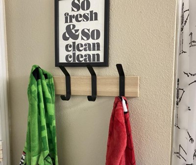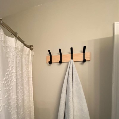 Use this Mixed-Material 4-Hook Rail from Brightroom™ to keep your space neatly organized and clutter-free. The two-tone hook rack is designed with a light brown woodgrain plank-style base and features four metal hooks in matte black for hanging hats, clothing items, towels, robes and more. This four-hook rack conveniently mounts on any wall and helps create quick, easy and space-saving organized storage in your home.