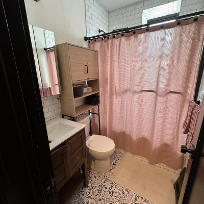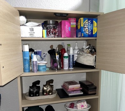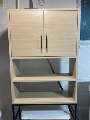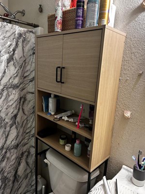 A: Hi Denise - Thank you for your interest in the Mixed Material Bath Etagere. This etagere features a single-shelf main compartment with double doors and two open shelves below to offer plenty of storage space for all your bath essentials. Happy shopping! - Emma