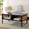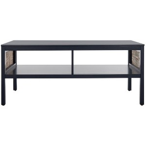 Make a warm and refined statement with our stylish Miya coffee table. Our sleek and streamlined coffee table stands out with a rich textural appeal. A beautiful rattan mesh is juxtaposed against a navy and natural veneer to serve as a warm and inviting centerpiece. Its minimalistic profile evokes relaxed refinement to sit easily in your casual living space, family dens, and bedroom. Our coffee table features two large open shelves to keep your remotes, coasters, and other essentials within easy reach.