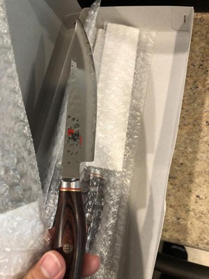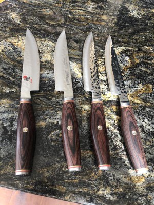 I have been a fan of Japanese cutlery in my kitchen for a while and wanted to introduce it to my table as well. These blades are both beautiful and functional. The Pakkawood handles with the gold and red accents really stand out. The curved belly of the handle is very comfortable to hold. The blade is super sharp and very easy to maintain. The hammered and sandblasted edge make them truly unique.