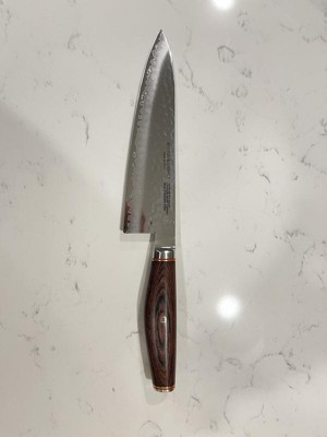 MIYABI celebrates Japanese craftsmanship with Artisan. Using traditional methods and innovative techniques, these knives merge the past and present into an exceptional knife collection.The potent core of SG2 micro-carbide powder steel is layered in a Tsuchime finish. This exquisite, hand-hammered effect helps prevent food from sticking. Each knife features a hand-honed blade finished with a true katana edge, a homage to the samurai swords made in Seki centuries ago.Fabricated with special Cocobolo Rosewood pakkawood, the handles mirror the beauty of the blade. Sophisticated details include brass and red spacers, a mosaic pin and a stainless steel end cap. The attractive D-shaped handle is designed to nestle comfortably in your hand for tireless cutting. Handcrafted in Seki, Japan.