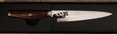 MIYABI celebrates Japanese craftsmanship with Artisan. Using traditional methods and innovative techniques, these knives merge the past and present into an exceptional knife collection.The potent core of SG2 micro-carbide powder steel is layered in a Tsuchime finish. This exquisite, hand-hammered effect helps prevent food from sticking. Each knife features a hand-honed blade finished with a true katana edge, a homage to the samurai swords made in Seki centuries ago.Fabricated with special Cocobolo Rosewood pakkawood, the handles mirror the beauty of the blade. Sophisticated details include brass and red spacers, a mosaic pin and a stainless steel end cap. The attractive D-shaped handle is designed to nestle comfortably in your hand for tireless cutting. Handcrafted in Seki, Japan.