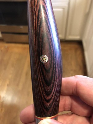 [This review was collected as part of a promotion.] Even for a company renowned for high quality products, I was in awe of this knife. The hammered/Damascus style of the blade is stunning, especially with the mirror finish polish. But what really jumped out at me was the one-piece (rosewood?) Pakkawood handle, beautifully accented with brass wire