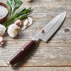 MIYABI Artisan knives combine exceptional beauty with expert craftsmanship. The knives feature an industry-leading micro-carbide SG2 core, plated in nickel and stainless steel for outstanding cutting performance and a stunning hammered "Tsuchime" finish. Each knife is hand-honed in Seki, Japan using traditional Japanese sharpening methods, resulting in scalpel like sharpness that glides effortlessly through food. The uniquely shaped handle is ergonomically designed to be comfortable in the hand. Constructed of Rosewood Pakka wood, the MIYABI Artisan handle features decorative accents and a stainless steel endcap, enhancing its striking appearance.