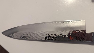 Unbelievably sharp knife. Great heft and feel in the hand. Precise cutting. A chef's dream