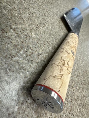 [This review was collected as part of a promotion.] Beautiful knife with unique birch wood handle. It is lightweight and feels well balanced in hand and sharp right out of the box.