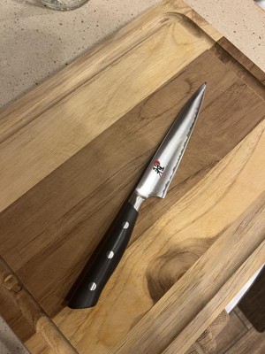 [This review was collected as part of a promotion.] This knife is our favorite knife, we use it for everything. The rounded edges are perfect, the blade is pristine and the cutting edge is crazy sharp. We couldn’t be happier with it and we will be buying more Miyabi knives later