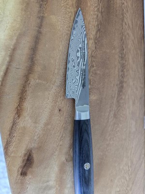 MIYABI strives for perfection with Kaizen - Japanese for "improvement" or "change for the better." This line of knives combines the best hardening technology with the artistry of traditional Japanese craftsmanship. The resilient core of VG10 super steel is protected by a stunning 64-layer flower Damascus pattern.The CRYODUR blades feature exceptional sharpness and durability thanks to their innovative, icehardening treatment. Then, artisans hand-hone the blades with the historic Honbazuke method. This attention to detail translates into precision cutting for MIYABI Kaizen users.The blade is balanced by a refined D-shaped handle made of black linen Micarta. With a wood-like texture, the comfortable handle won't slip from your hand and acts as a moisture repellant. Handcrafted in Seki, Japan.