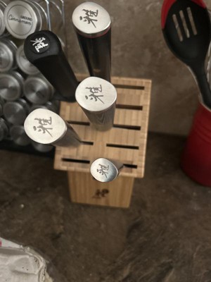 [This review was collected as part of a promotion.] Such a beautiful set of knife, very light yet sharp enough to cut a piece of paper lengthwise! I wish they have more knives in a set to completely fill the spaces on the block :)