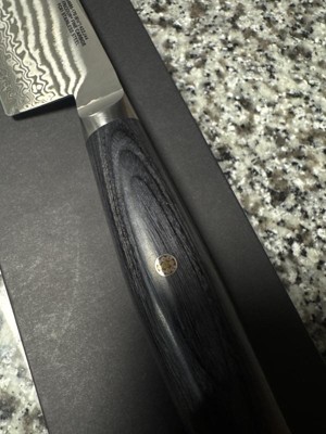 - Handle made of black pakkawood and stylishly stamped with a mosaic pin. End cap features the Miyabi logo.