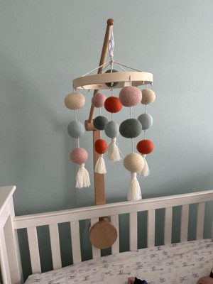 This Mobile with Round Balls Crib Toy from cloud island™ gets your little one wiggling, moving and having fun. This mobile crib toy has strings of soft, colorful wool balls and tassels hanging from the top ring, which sway gently to keep them occupied and entertained. It's designed with a rotatable stand with a brown wood finish, which allows you to easily alter the orientation of the toy. You can give this cute crib mobile to your baby or gift it to expecting parents at a baby shower.
