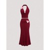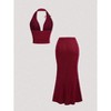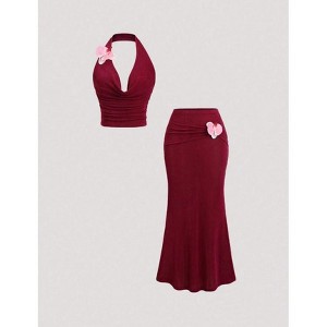 This Women's Two-Piece Outfit for Daily Wear combines timeless elegance with modern versatility. The set features a wine-red base adorned with delicate pink floral accents, creating a sophisticated yet feminine aesthetic. The sleeveless top boasts a plunging V-neckline and a daring open-back design, balanced by the floor-length skirt that hugs the curves for a flattering silhouette. Crafted from stretchy, smooth-textured knit fabric, it offers all-day comfort while maintaining a polished look. Perfect for casual brunches, evening strolls, or even semi-formal gatherings, this ensemble effortlessly transitions from day to night.