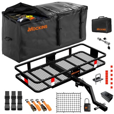 The Mockins Extendable Roof Carrier Set features a rust-proofed steel basket, which extends from 43 to 64 inches in length, supports a hefty 250 lbs of cargo and offers a number or tie down options for your convenience. Simply secure the basket to your vehicle's crossbars, using the provided u-bolts and choose between the water-resistant ratchet straps, bungee net or a combination of both to secure your load. The provided bungee net is manufactured using 6mm thick cording and has 4x4" mesh holes and tight joints to keep your cargo securely in place throughout your drive. It measures 36"x39" and can be stretched to 75"x80" to accommodate loads of many shapes and sizes. The water resistant, heavy-duty polyester ratchet straps feature an extra strong, 3-cross-stitch sewing and were designed with rubber coated steel hooks and an easy release spring loaded latch for durability and ease of use. The roof basket can also be used with a Mockins 16 or 20 cubic foot waterproof cargo bag to further protect your luggage from outdoor elements such as rain, snow, sand, dust and sun.