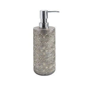 The Marrakesh bath collection, includes this elegant resin lotion/soap dispenser has a sleek and sturdy design that boasts a dark grey finish with delicate white accents and exquisite flowers thatappear to be embroidered. Add a touch of sophistication to your countertop with this unique collection. This durable dispenser is perfect for daily use and holds up to 11 ounces of your favorite lotion or soap.