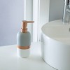 The Tosca soap/lotion dispenser brings refined style to your bathroom. Crafted from durable resin, it features a sleek gray and white body, artfully divided by a bronze line for a modern touch. The pump mechanism ensures smooth dispensing, while the elegant design complements any décor. Functional and stylish, Tosca adds a sophisticated finish to your countertop.