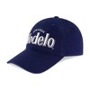 - MODELO BASEBALL HAT: Blue cotton ball cap embroidered with the Modelo Cerveza logo