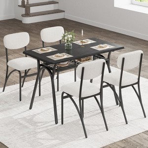 Upgrade your dining area with this modern 5-piece dining set combining style and functionality. Featuring a sleek black rectangular table with a scratch-resistant, warp-resistant surface and a built-in lower storage shelf, it maximizes space and durability. The set includes four beige boucle fabric chairs with ergonomic high backs and plush foam cushions for lasting comfort. Designed for small spaces, the chairs tuck neatly under the table to save room. Supported by sturdy metal legs with non-marking feet and capable of holding up to 150 lbs, the table offers stability and floor protection. Easy to assemble with clear instructions and numbered parts, it’s perfect for apartments, breakfast nooks, and open-concept layouts.