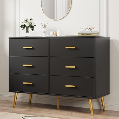 Modern 6 drawer storage chest with gold handles and metal legs for a living room, hallway or entryway