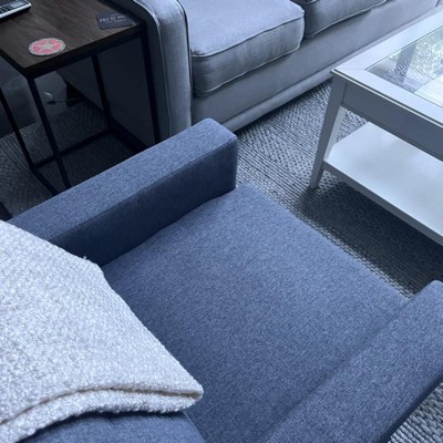 This chair looks great, is fairly comfortable, and was easy to put together. I ordered a gray chair, but the fabric is very, very blue. (See the photo of the chair in the foreground with my gray couch and gray rug.) It doesn’t go well with the rest of my living room, but I already discarded the box. Maybe I received a blue chair instead.