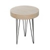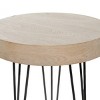 - •Brown accent table features a round top with natural wood graining and supported by three hairpin style legs