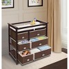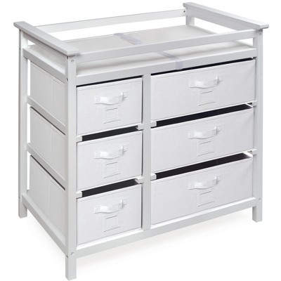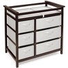 Badger Baskets Modern Baby Changing Table with Six Baskets is a smartly organized and endlessly practical place for diaper changing and dressing your baby. Three large and three small baskets hold diapers, wipes, creams, blankets, toys, and more. Pull-out baskets glide smoothly on support rails and are fully removable so you can find small items that get buried at the back of the drawer. Basket handles make them easy to open one handed during diaper changes. Insert your own nameplates into the pockets on the front of each basket so you know whats stored inside. Reversible, two-color baskets make it easy to customize the look of your nursery in numerous combinations! Flip the baskets around so all the large are the same color, and the small baskets are another. Have fun with a checkerboard or random pattern! If you dont use the baskets, there is a bottom shelf and a tall, open storage area where you can stack blankets, stow a large box of diapers, or place your diaper pail. The baskets can be used separately from the table to organize a closet, or fold them flat for storage if they are not being used. This changing table also features safety rails around the top and includes a comfy foam changing pad and a safety belt. Metal support bar beneath the changing surface provides additional stability. When your toddler outgrows this table, it becomes a handy storage solution for training pants, toys, stuffed animals, mittens, blankets, coloring books, school papers, and more. Table is reversible so the large/small baskets can be either on the left or right. Table frame is made with multi-layer wood and MDF with veneer. Basket fabric is 80% Polyester/20% Cotton on the exterior, and non-woven fabric on the interior and bottom board. Changing pad is polyurethane foam covered with PEVA vinyl. Adjustable, nylon safety belt has a plastic buckle. All paints and finishes are non-toxic. Overall changing table measures 34.25 inches L x 20.75 inches W x 34.25 inches H. Width not including top trim: 19 inches. Large Baskets: 18.5 inches L x 17 inches W x 7 inches H. Small Baskets: 10 inches L x 17 inches W x 7 inches H. Height clearance from the floor to bottom rail: 3 inches. Changing area: 31 inches L x 17.5 inches W, 4.25 inches H at the side rails, 5 inches H at the end panels (without changing pad in place). Changing pad: 31.5 inches L x 17.5 inches W x 1 inch H. If large baskets are removed, shelf area is 18.75 inches L (17.25 inches L between the basket tracks) x 17.5 inches W x 28 inches H. If small baskets are removed, shelf area is 10.25 inches L (8.75 inches L between the basket tracks) x 17.5 inches W x 28 inches H. Assembled weight: 28.6 lbs. All measurements approximate. Wipe the table and changing pad clean with a damp cloth and mild soap as needed and dry thoroughly. Spot clean baskets as needed. Never immerse the baskets in water due to the internal cardboard support panels. Basket color depends on color of the table (baskets are either White/Gray or Ecru/Espresso). Changing table is for use with children weighing up to 30 lbs (13.6 kg). Adult assembly required. Illustrated assembly instructions included. Meets all currently applicable safety testing standards. Product includes a limited warranty of 30 Days Parts to the original purchaser. Product may vary slightly from shown and described. Props/accessories shown are for illustration purposes only and are not included with the product. Actual color/finish may vary slightly from screen display. This item ships in its original carton which may include a product photo.