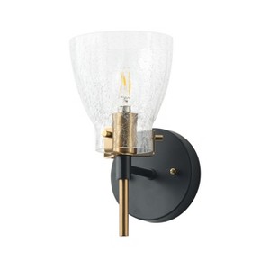 Add a touch of modern elegance to your space with this ETL-listed black and brass wall sconce. Featuring a slim iron frame in matte black with antique-style brass accents and a clear crackle glass shade, it offers both visual interest and warm, diffused lighting. Ideal for use in bathrooms, hallways, bedrooms, or entryways, this reversible fixture can be mounted facing up or down. Its compact size and E12 socket make it a stylish yet functional choice for any modern, farmhouse, or transitional interior.