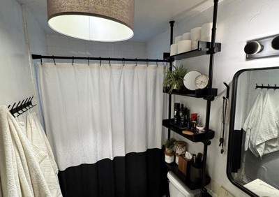 A: The shower curtain has a modern colorblock design in black and cream hues.