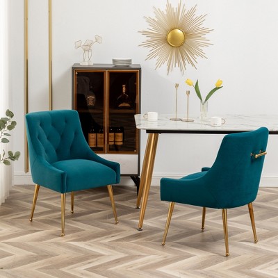 Elevate your dining ambiance with these opulent velvet dining chairs. Indulgently soft and cozy, each chair boasts a firm high backrest ensuring optimal support, complemented by robust metal legs for steadfast stability. Adorned with gold back pulls, these chairs exude a timeless allure reminiscent of Hollywood's golden era. Offered as a set of 4, they effortlessly infuse a sense of refinement into your dining room, kitchen, or any area craving a dash of sophistication.