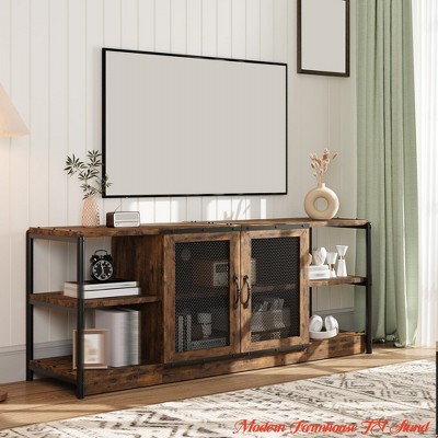 Measuring 70.86 L x 18 W x 25 H inches, this modern tv stand features a warm wood finish paired with a sturdy black metal tube frame and two black wire mesh cabinet doors. Its chic farmhouse furniture design blends effortlessly into your living room or bedroom