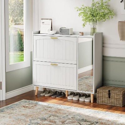 Modern Freestanding Shoe Cabinet, Narrow Shoe Rack Cabinet with 2 Flip Drawers, Shoe Cabinet Organizer with Metal Leg for Entryway Hallway White