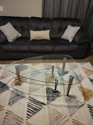 This geometric rug was the piece that brought the room together. It has squiggled triangle shapes and short fibers (which means it vacuums really well!). It seems to be a stiff durable rug with a grid backing (it isn't non slip, which is OK for us because it's on carpet). The only slight problem is sometimes it rolls up from time to time from being folded when shipped.