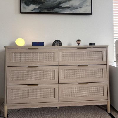 Bring timeless charm and functionality to your space with this mid-century modern dresser, featuring a woven rattan front and solid wood legs for a warm, rustic-chic appeal. Built from durable engineered wood with metal hardware, it’s designed to last. The spacious drawers and wide tabletop offer generous storage, while anti-tip hardware ensures added safety. Perfectly versatile, it works beautifully in bedrooms, entryways, apartments, and more.