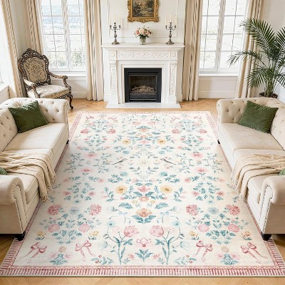 Modern Machine Washable Area Rugs,Large Carpet for Bedroom Living Room, Low Pile Non-Slip Area Rugs for Playroom Dining Room Office Decor, Pink&Green