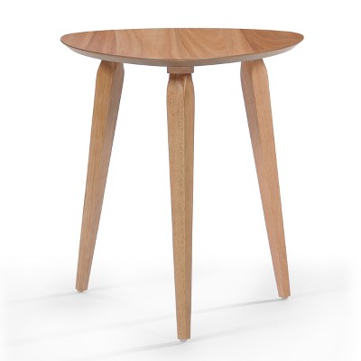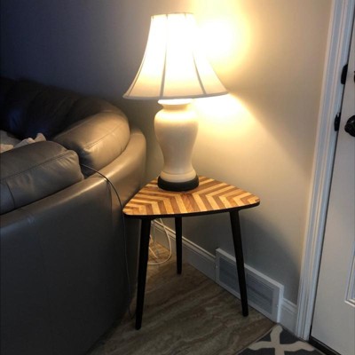 Bring a finishing touch to your home with an inviting appeal with this beautifully crafted accent table. A compact friendly table providing you with additional surface storage space any where in your home. Modern triangle accent table in brown features simple design that will compliment other wood and metal furniture for a sophisticated style. This item ships in 1 carton. Due to the handmade nature of this item, no two will be alike, there will be slight differences in shape, size, and color. Suitable for indoor use only. Some assembly required. Maximum weight limit is 100 lbs. Made in India. This is a single brown colored end table. Modern style.
