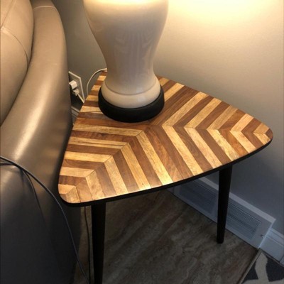 - •Wood triangle accent table showcases chevron top that adds textural beauty and secure grip for any tabletop display