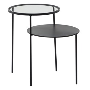 - Captivating round accent table features a clear glass finish and a polished black iron finish