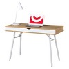 This Techni Mobili Computer desk with storage is constructed out of particle board, with a laminate surface and supported by white powder-coated steel legs. This desk features a full width multi-compartment storage drawer to store all of your accessories and it even has enough space for a laptop or tablet. The back of the desk top opens up for accessible cord management. Easy and ready to assemble. Desktop has a 50 lbs. max weight capacity. Color: Pine