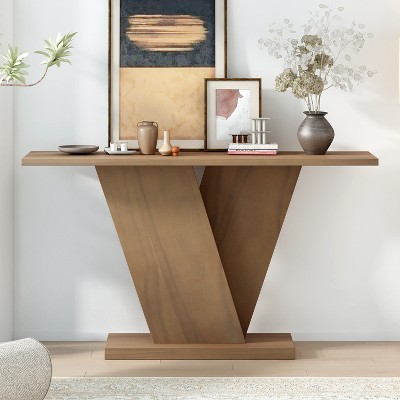 Modern Natural Oval Console Table with Oak Veneer and Fan-Shaped Legs,MDF Entryway Table with 2 Drawers for Living Room or Hallway-Koiai