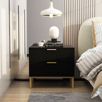 Modern Nightstand with USB Charging Station, Gold & Wood Fluted Bedside Night Stand with 2 Drawers, USB Ports & Outlets
