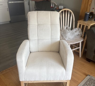 Modern Nursery Rocking Chair with Linen Upholstery, Ergonomic Recliner, Adjustable Footrest, USB Ports, Side Pocket, Wood Frame