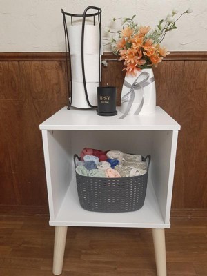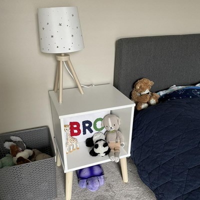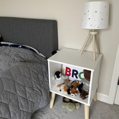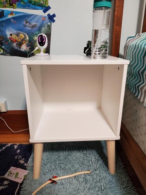 Even small rooms can get an instant upgrade with the convenience of this simple yet stylish Modern Open Nightstand from Pillowfort™. Featuring a square shape with an open front and four legs, this white and natural wood nightstand is perfect for placing next to their bed with a lamp on top and their favorite bedtime stories or stuffed animals inside. The open design lets you display decorative items while also providing easy access to contents. Plus, the clean lines, slender legs and white color palette coordinate easily with a wide variety of bedroom decor.