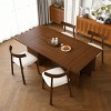 - Modern rustic design blends natural wood veneer textures with clean lines for versatile dining spaces.