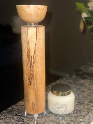 [This review was collected as part of a promotion.] This decorative candle holder is very versatile in design, it can be bohemian or farmhouse aesthetic. It can also be like a Nancy Meyers aesthetic. I feel like it be used in a lot of different ways due to subdued coloring. The candleholder itself is pretty large, so be aware of that. It's made of primarily light grained wood with clear acrylic details. As well as a metal top where you place the candle. Personally I’m not a fan of the clear acrylic detailing, it kind of throws off the whole style. And I do think that it’s too large as it only came with one candleholder. In the promo pictures, it comes with another small one and they off set each other, making it look cohesive. However, just by itself, it doesn't look very cohesive with other surrounding decor. It was packed EXTREMELY well, in two boxes with thick paper (LOL). I also did see when looking very closely at the woody base that there was visible glue, its not very noticeable, but its something to note.