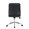 The Millennial Modern Home Office Chair in black is made with CaressoftPlus material. CaressoftPlus is a trademarked vinyl that is an ultra-soft, breathable upholstery that looks & feels like leather, but more durable & easy to clean. The 27 inch chair base is designed with fancy high crown chrome and has 2 inch nylon dual wheel castors for smooth rolling. The chair has a 275 lbs. weight limit in addition to offering tilt tension, a pneumatic gas lift and an upright lock.