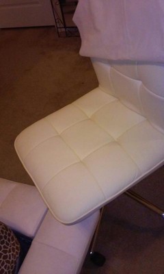 The chair is well made and rolls surprisingly well. The white I received is definitely a pure white (cool undertones) and not off white. It is comfortable, soft giving seat. The style and design isn’t meant for perfect lumbar support so just be aware of that. Moves up and down a few inches for height adjustment. Wheels were a bit of a pain to install.