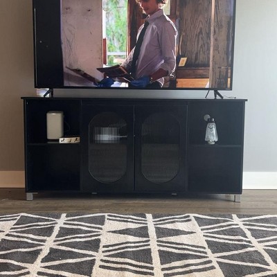 CHIC DESIGN: Seamlessly blending a sleek black entertainment center with open shelving, this modern media console embodies a contemporary aesthetic through its bi-material construction. Combining glass-front compartments with grooved wood details, the cabinet exhibits transitional elegance, presenting clean architectural lines that easily adapt to a variety of interior decors