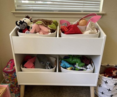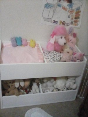 My daughter and I are really enjoying this Pillowfort Modern Two Shelf White Toy Bin. It looks great in her room especially the overall size works great. It is large enough to hold her toys, some blankets and clothes. I like the white color which blends in well with the decor in her room. It comes with a strap to secure it to the wall if needed and I didn't use the legs but they are wood and look nice if that's the look you want. It was pretty easy for me to put together because the instruction manual is well done and the pieces were marked with stickers. Overall really nice!