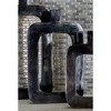 Chic and artfully made, this black vase features a unique cut-out center, creating a rounded rectangle sculptural shape. A semi-glossy black finish coats the aluminum vase with textural pocketing. The vase neck is a tall rectangle with no lip. Suitable for indoor use only. 1. 5" vase opening. Contemporary design. This item comes shipped in one carton.