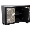 - •Rectangular storage sideboard features three cabinet doors adorn with embossed crescent moon molding in an abstract formation, and complemented with crystal round knobs for an elegant touch