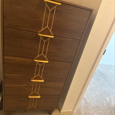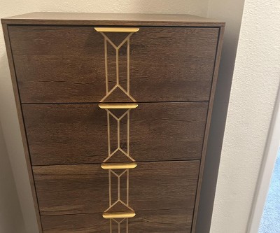 I love the gold detail on the dresser which is one of the reasons I purchased. The gold drawer handles are a bit cheap but it accents the gold detail nicely. I was looking for something budget friendly and this purchase was within my budget. I like the height of the dresser and I also like how decorative and solid the legs are. The dresser itself is not as solid as the legs but there’s and option to secure it to the wall with anti-tipping hardware. I’m a bit disappointed about the color of the dresser. The color selection available in the Target app is either black and white or oak and gold. I selected oak and gold but what I received is a walnut color. But it works well in my son’s room.